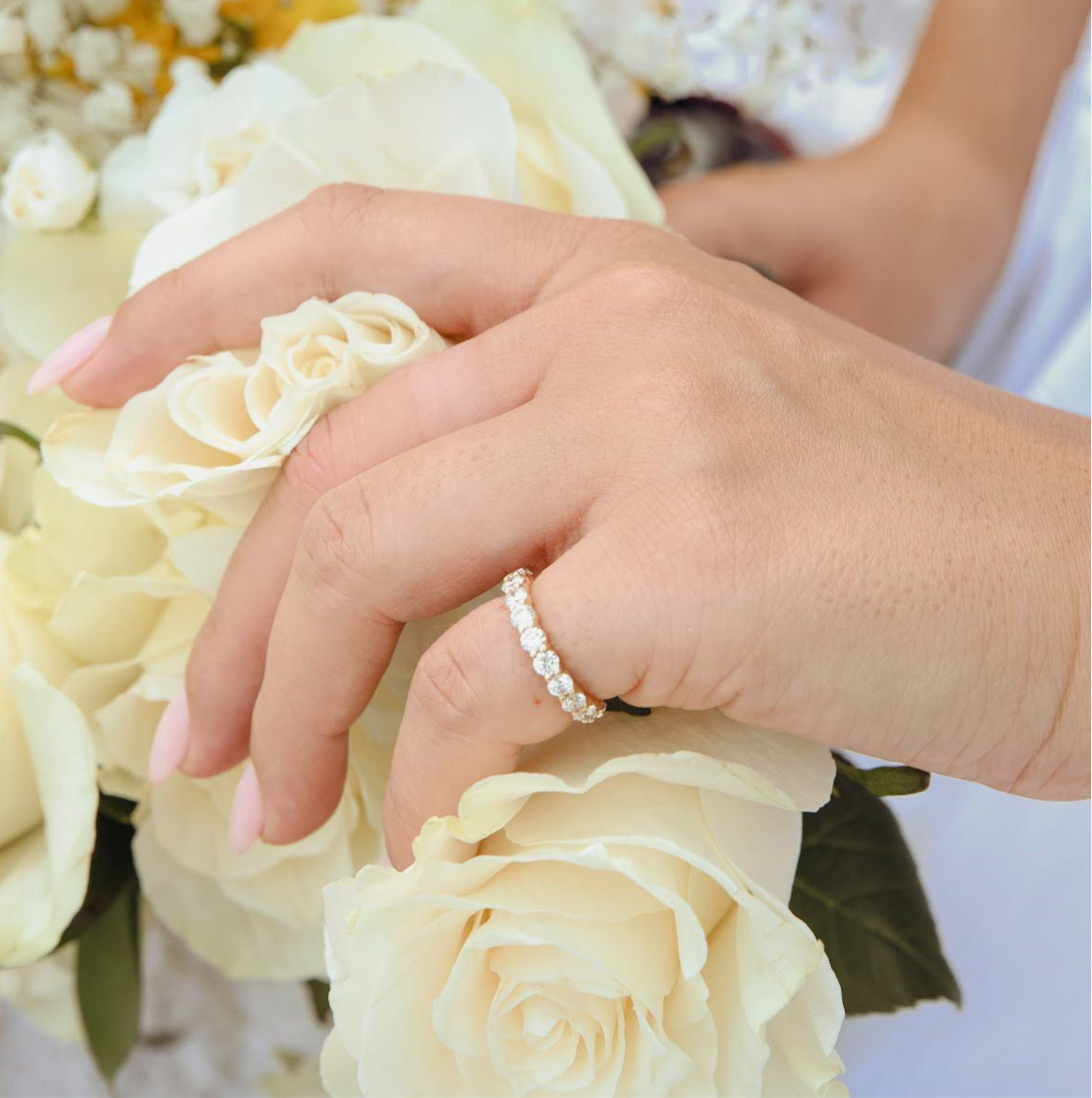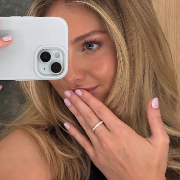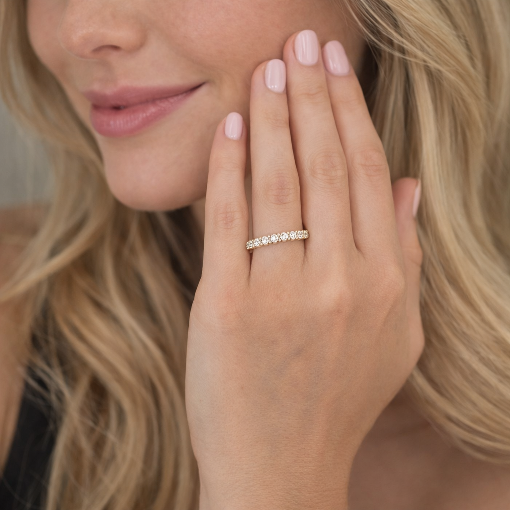 Each 3.2mm EF/VS round diamond is carefully selected for exceptional fire and clarity, creating a continuous line of sparkle that catches the light from every angle. With approximately 14 dazzling stones encircling the band, this piece offers an effortlessly luxurious finish—whether worn solo or stacked.